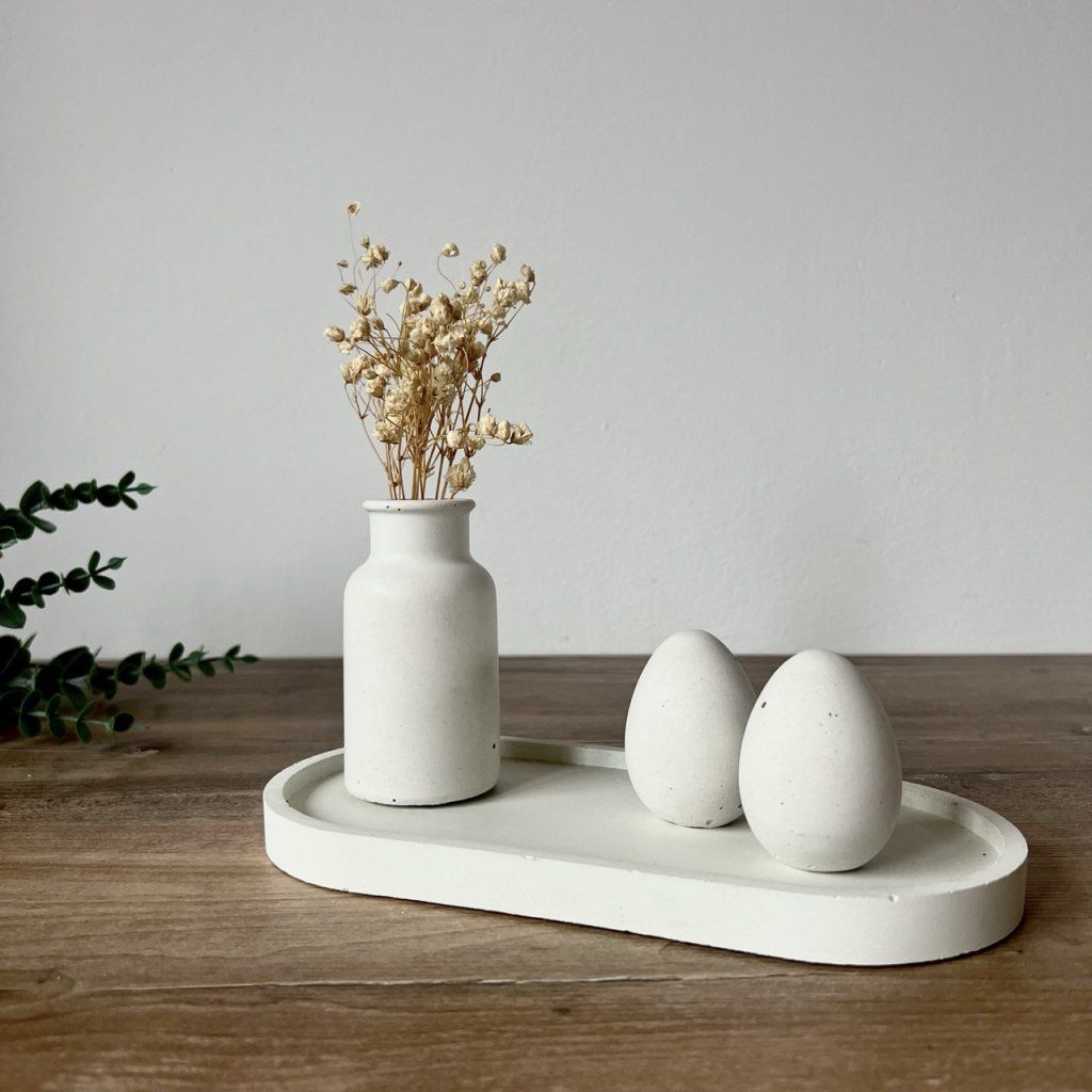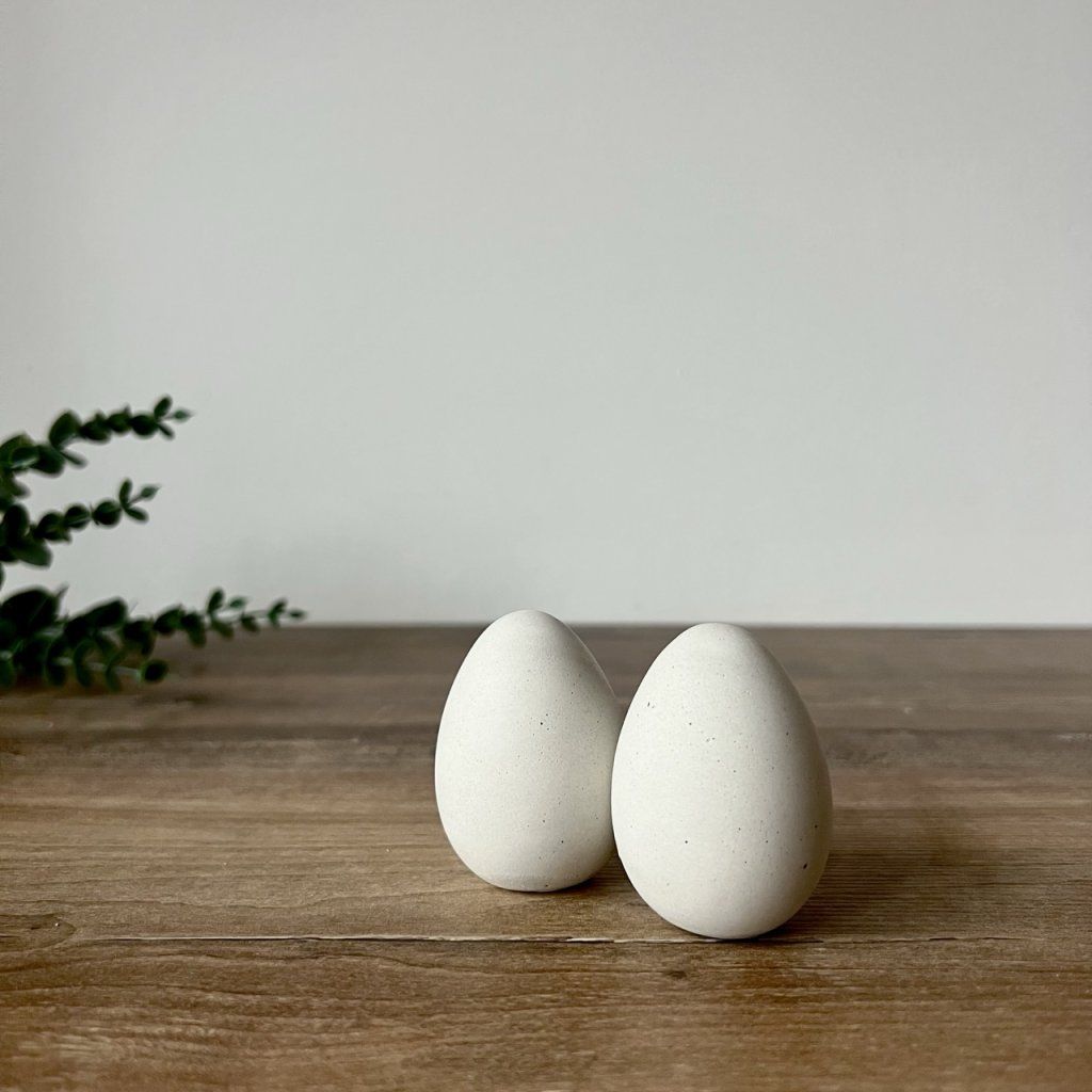 Bílý betonové vajíčko, které skvěle doplní velikonoční výzdobu, ale díky svému minimalistickému designu zapadne do interiéru po celý rok. Může stát samostatně nebo být součástí větší dekorace – vždycky zaujme svou surovou elegancí.