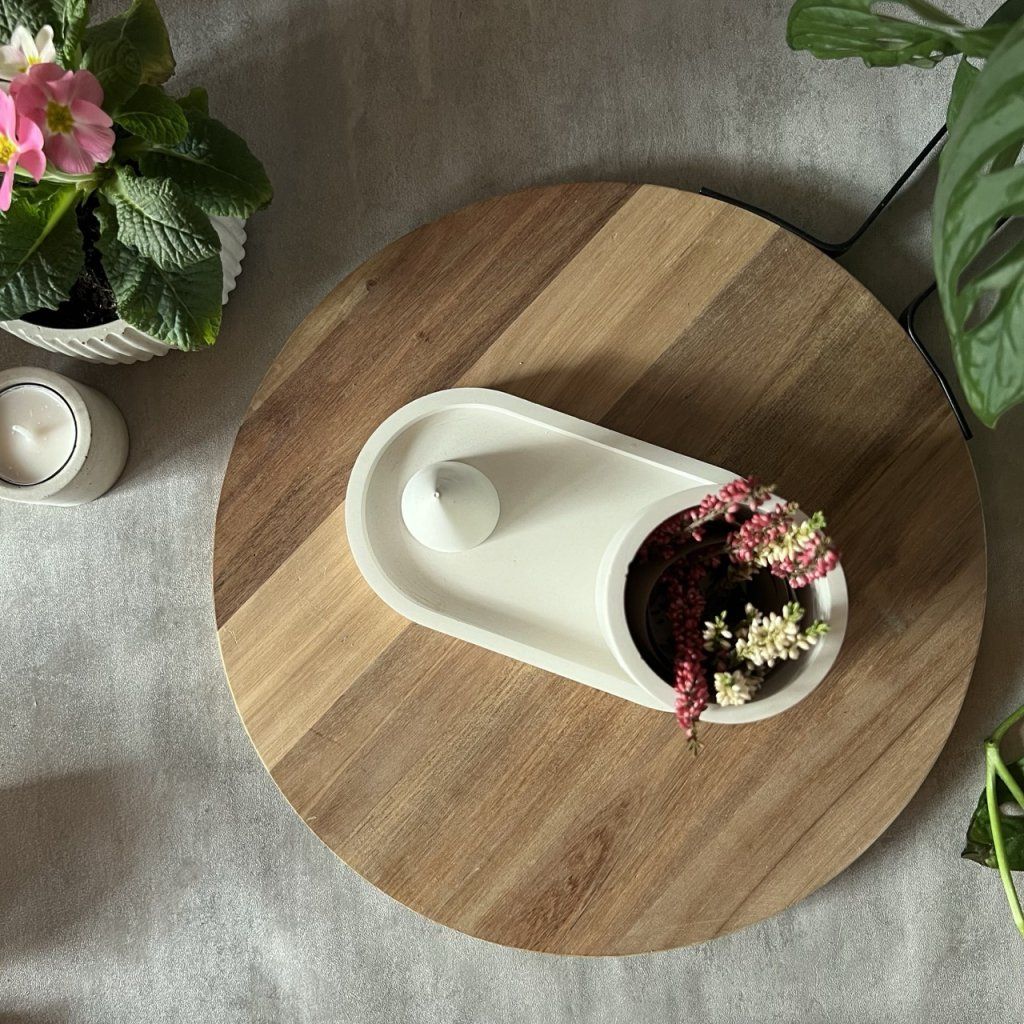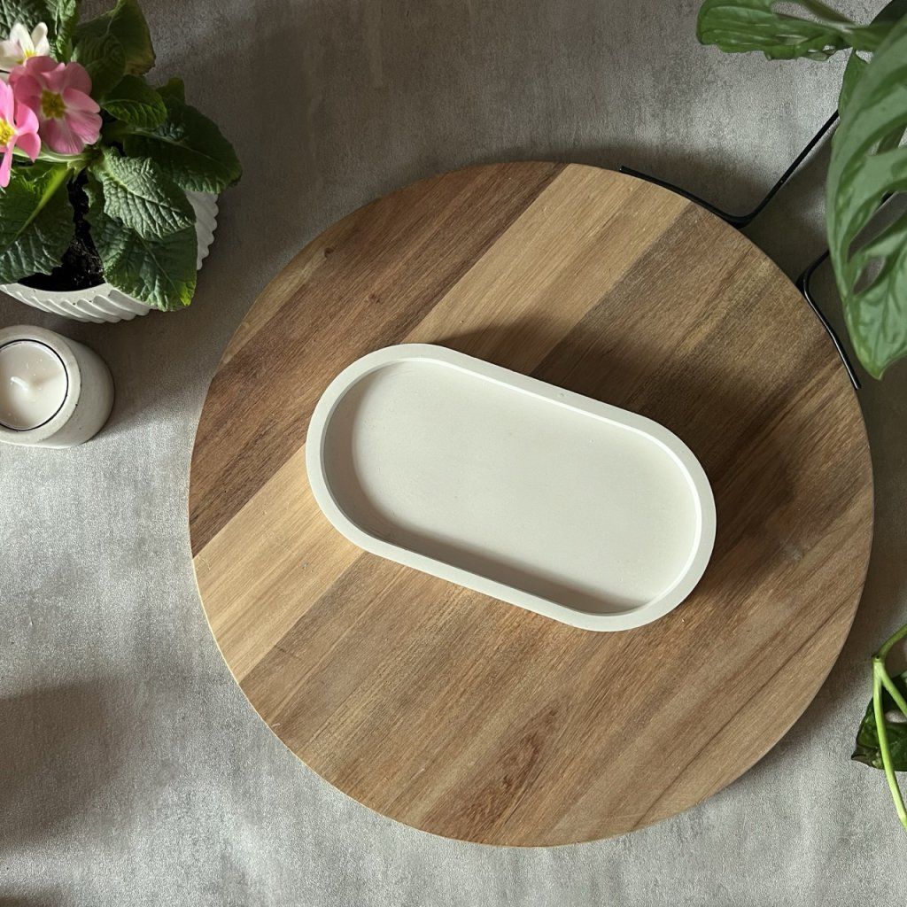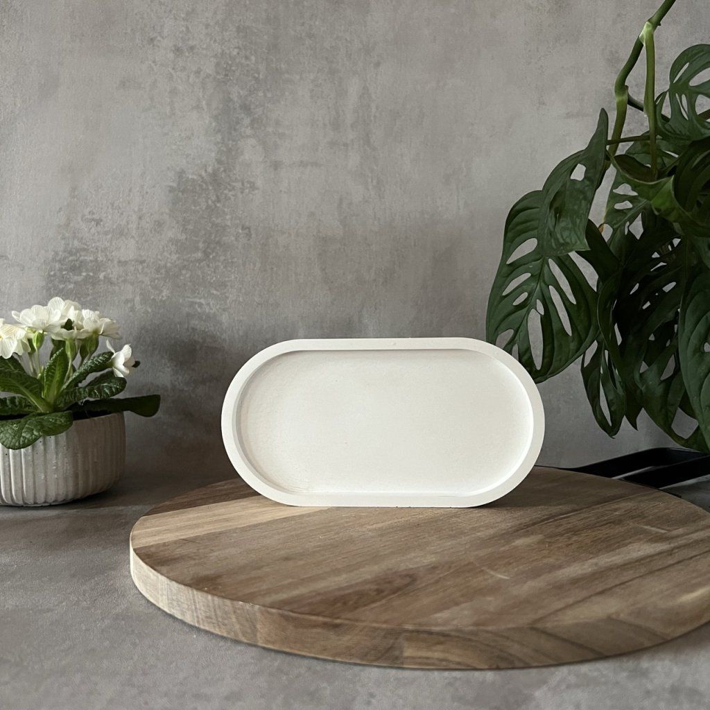 Bílý betonový oválný tácek je elegantní dekorativní prvek pro váš domov. S jemným oválným tvarem a hladkým betonovým povrchem dodává moderní a minimalistický prvek do vašeho prostoru. Jeho univerzální design umožňuje využití jako podložka pro svíčky, drobné dekorace nebo jako samostatný vizuální prvek na stole nebo polici. S pečlivě zpracovanými detaily a robustní konstrukcí je betonový oválný tácek praktickým a esteticky příjemným doplňkem pro každý interiér.
