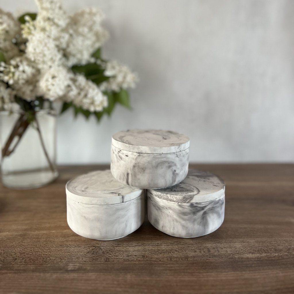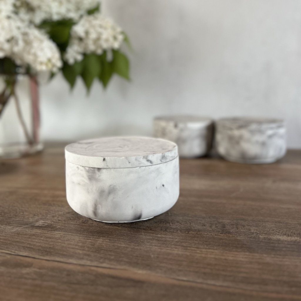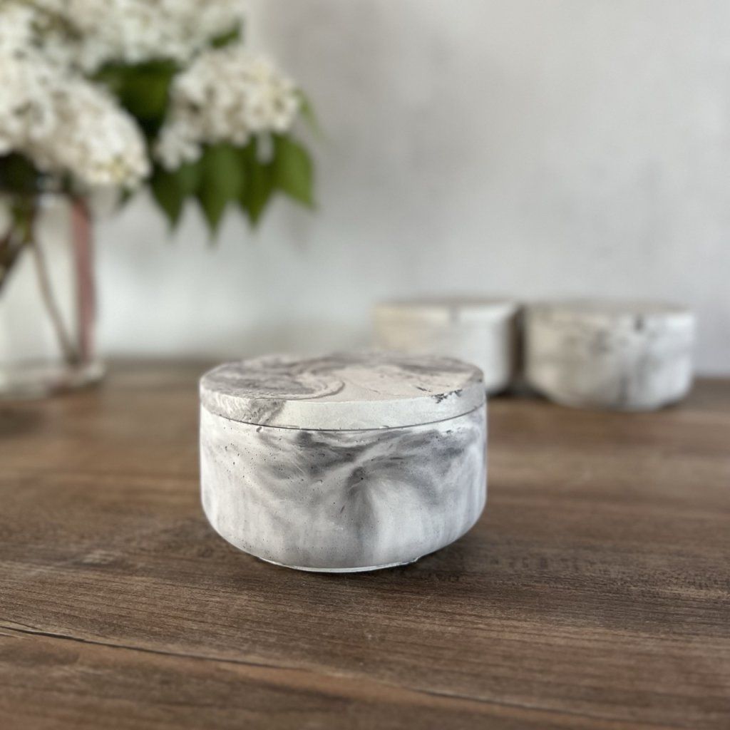 Mramorová sametově hladká a elegantně minimalistická, betonová miska s víčkem je univerzálním kouskem pro váš domov. Její jednoduchý design a neutrální barva umožňují využití jako praktického úložného prostoru pro drobnosti nebo jako moderní květináček pro rostlinky. Díky svému industriálnímu šarmu může být i samostatně stojícím dekoračním prvkem, který dodá vašemu prostoru jedinečný vzhled.