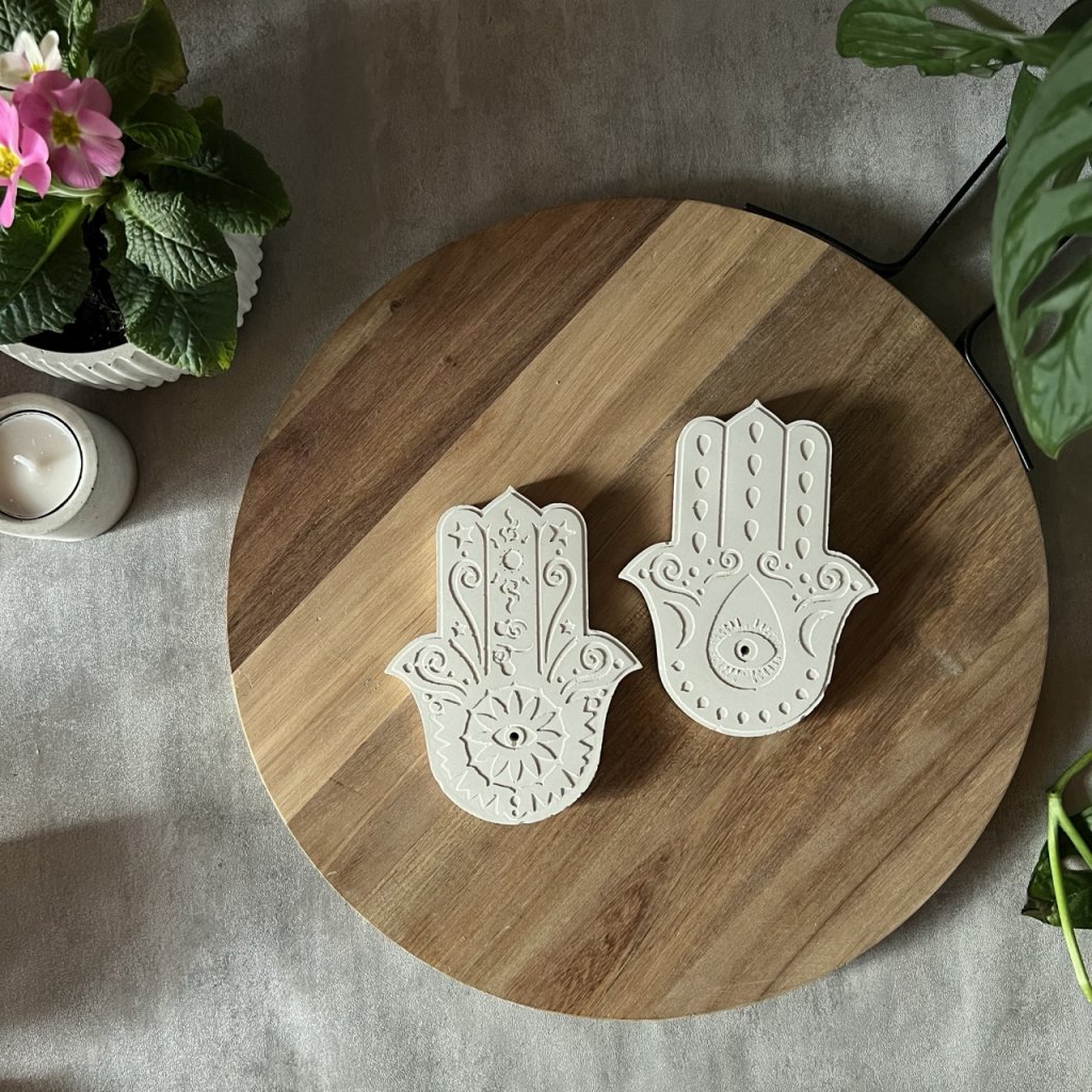 Šedý betonový stojánek na vonné tyčinky ve tvaru Hamza spojuje moderní design s mystickým nádechem. Jeho unikátní forma Hamzy, která je často považována za ochranný symbol, přidává do vašeho prostoru nejen krásu, ale i dávku duchovního významu. Tento stojánek nejen drží vaše vonné tyčinky elegantně na místě, ale zároveň může sloužit jako dekorativní prvek, který přináší do místnosti harmonii a pohodu. Oživte svůj domov touto kombinací dekorace a funkcionality.